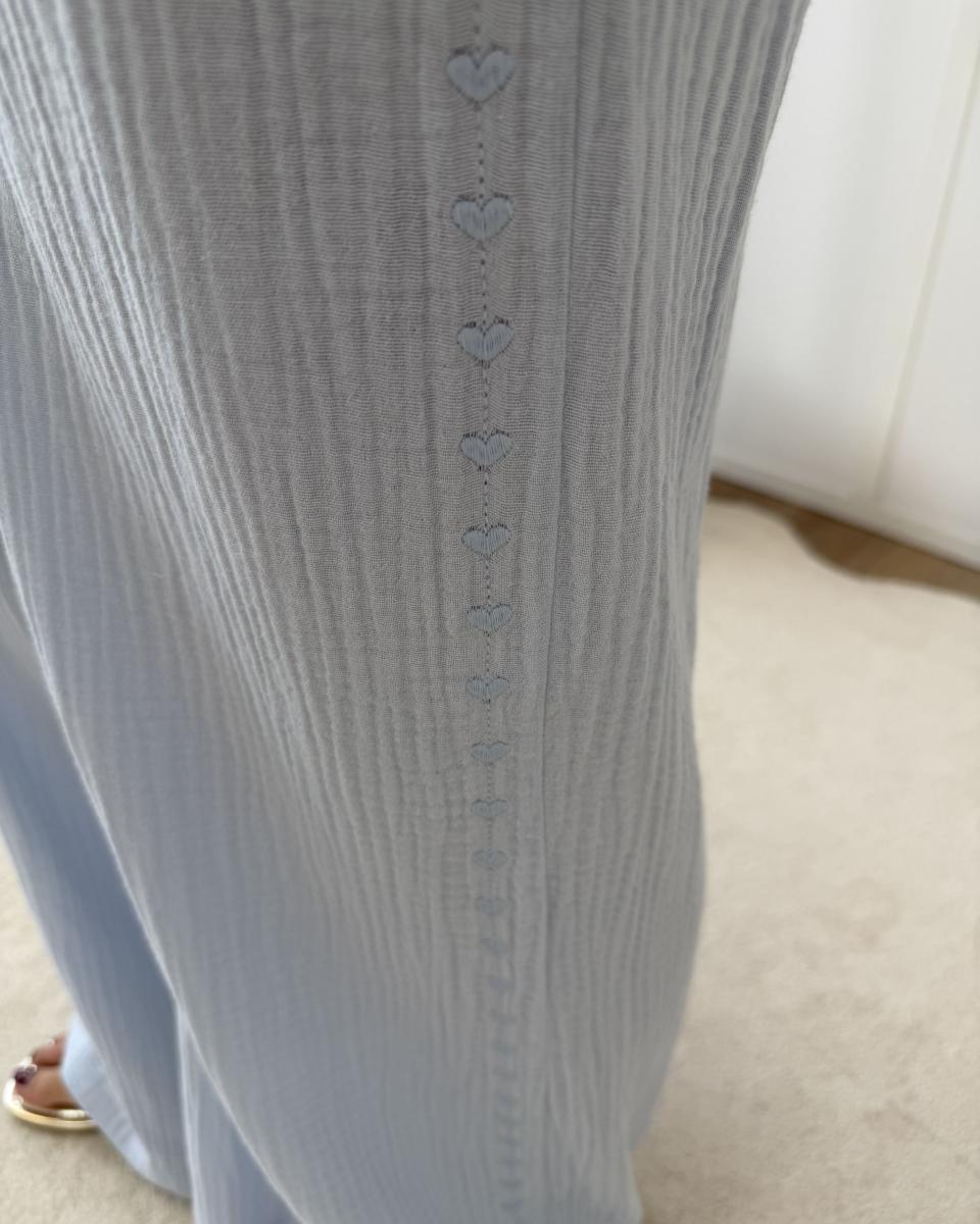 pantalon en gaze de coton avec coeurs brodés le long des jambes,
