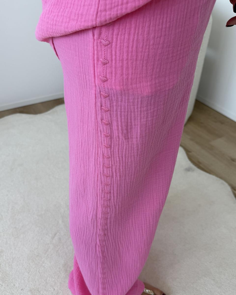 pantalon en gaze de coton avec coeurs brodés le long des jambes,