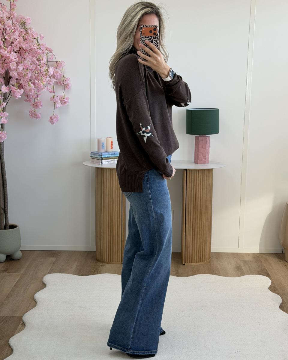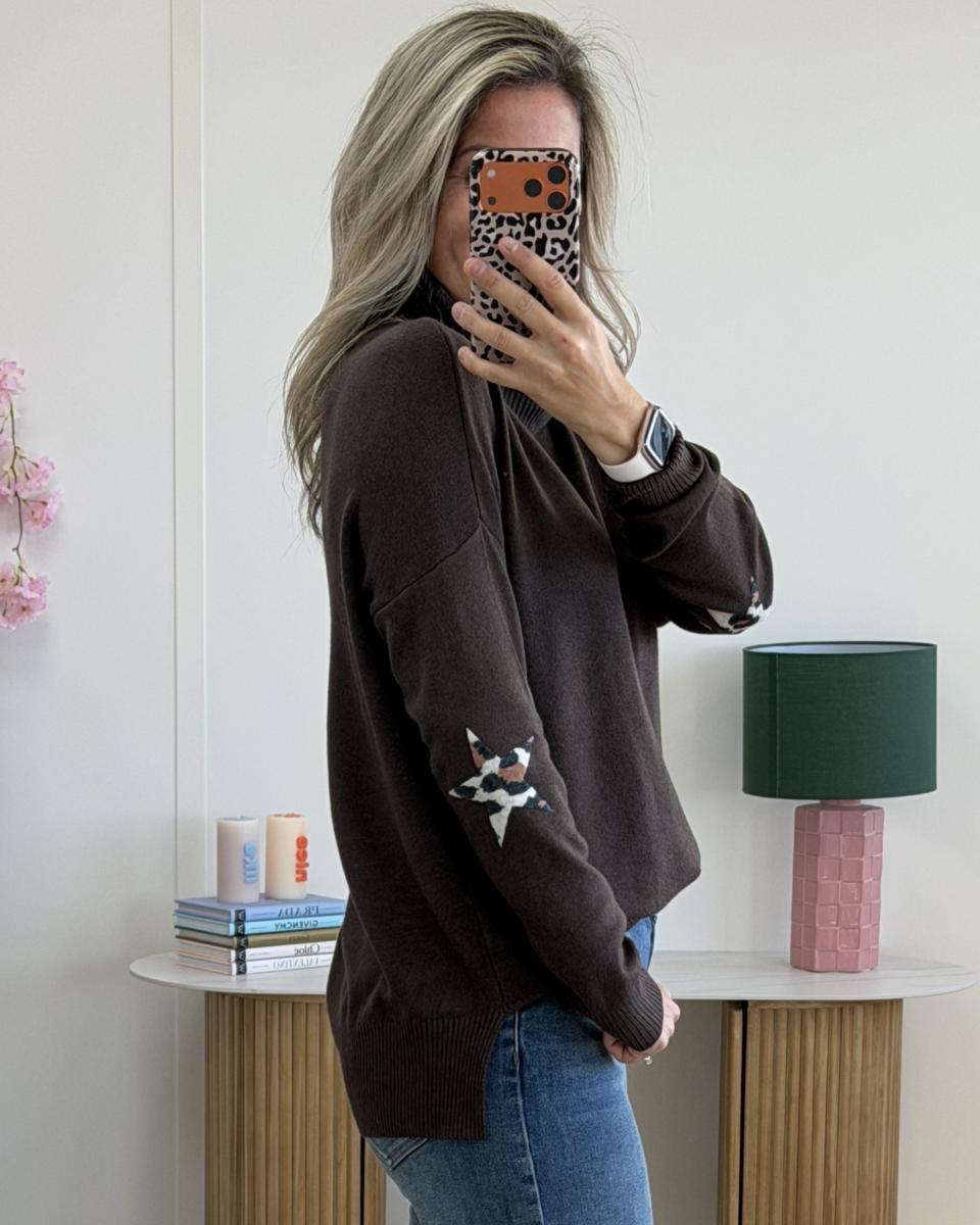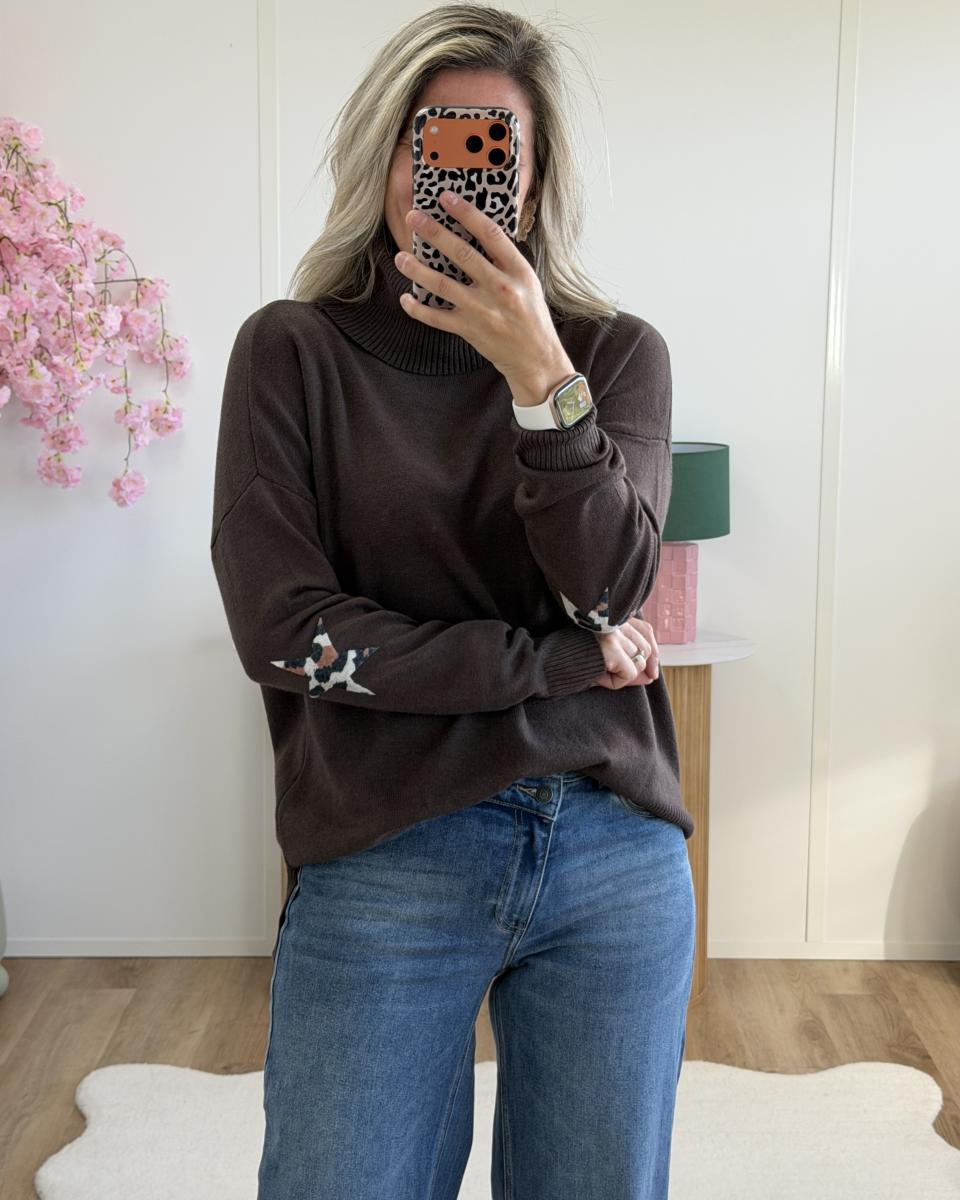 pull col roulé, légère fente sur les cotés, Etoiles léopard aux coudières et cœur léopard au dos