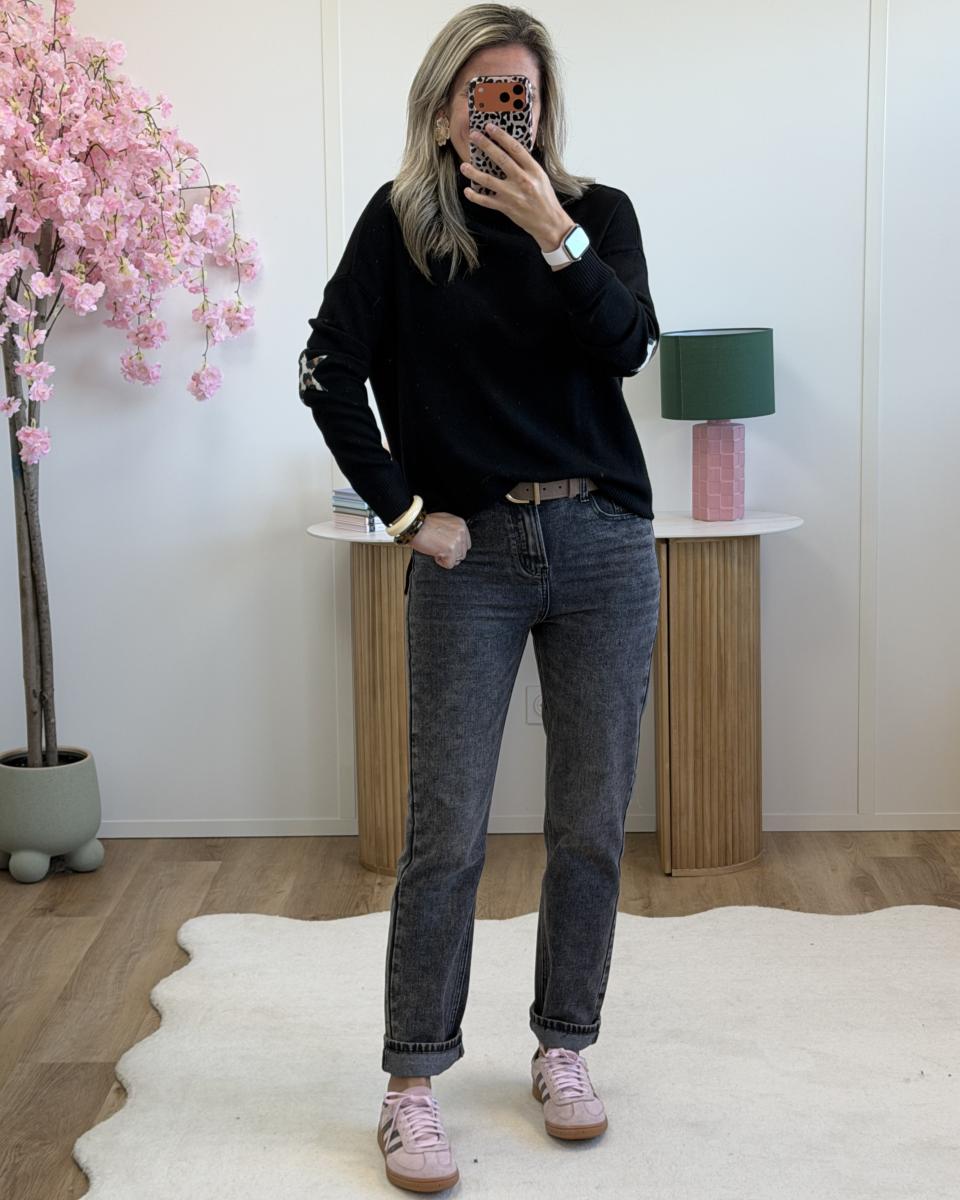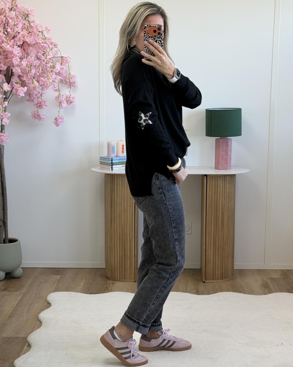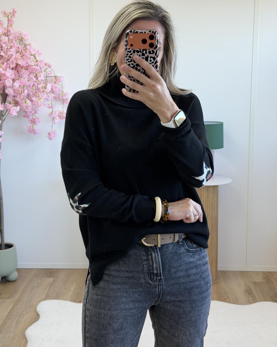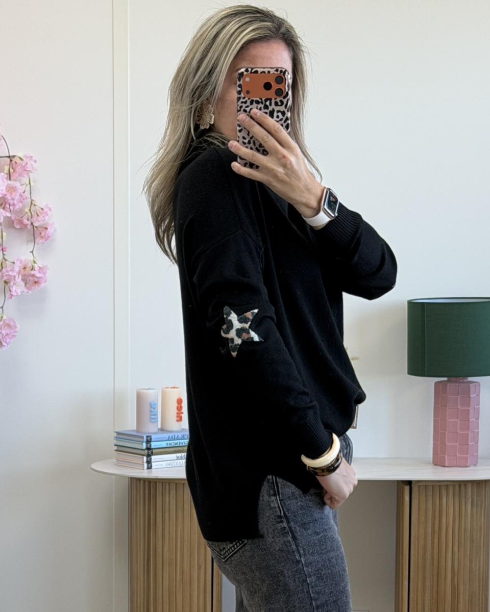 pull col roulé, légère fente sur les cotés, Etoiles léopard aux coudières et cœur léopard au dos