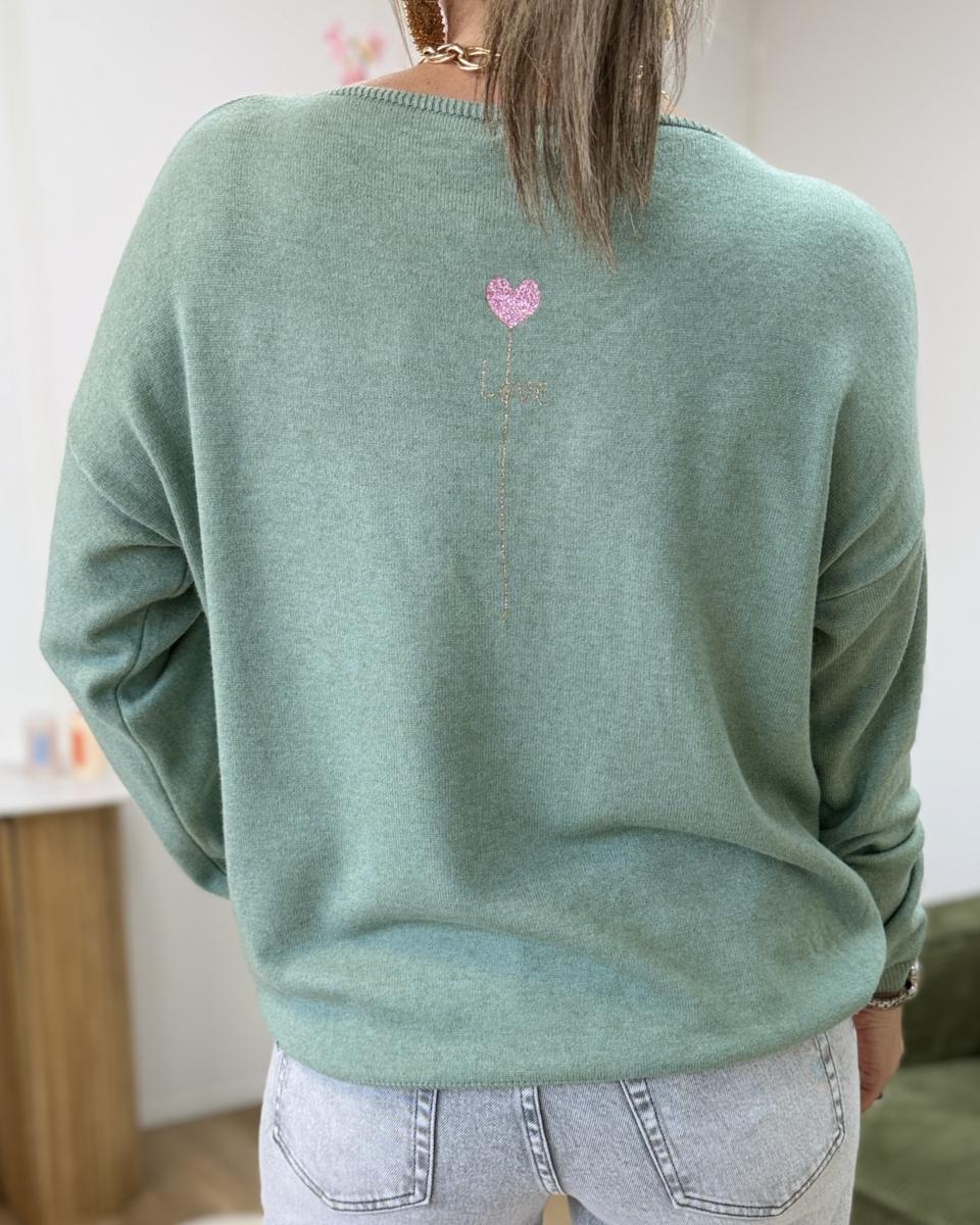 pull avec coeur doré devant et motif au dos